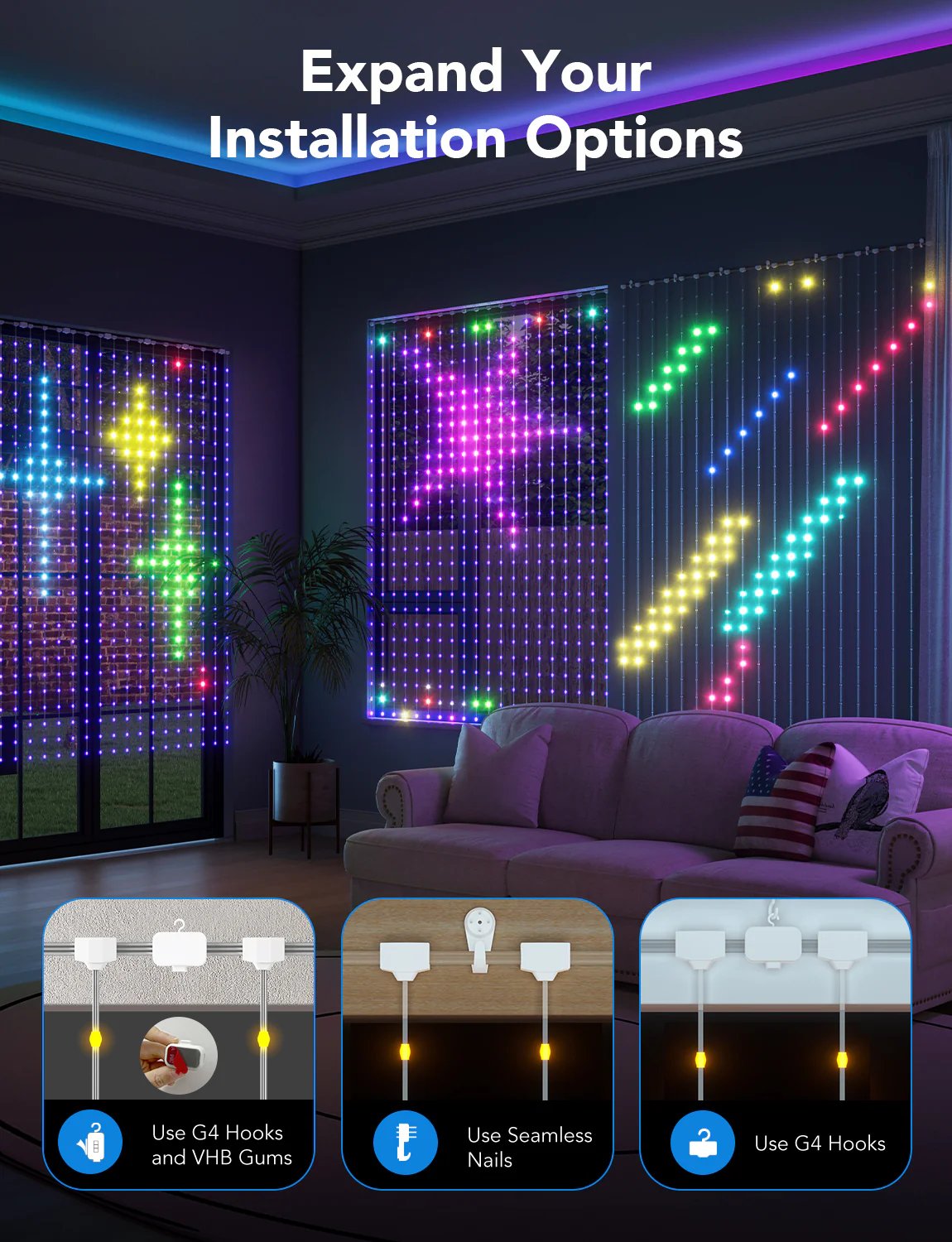 Transform your space with these stunning, smart-controlled curtain lights! Perfect for holidays, parties, or everyday ambiance, these LED lights create mesmerizing patterns and sync with music for an immersive experience.