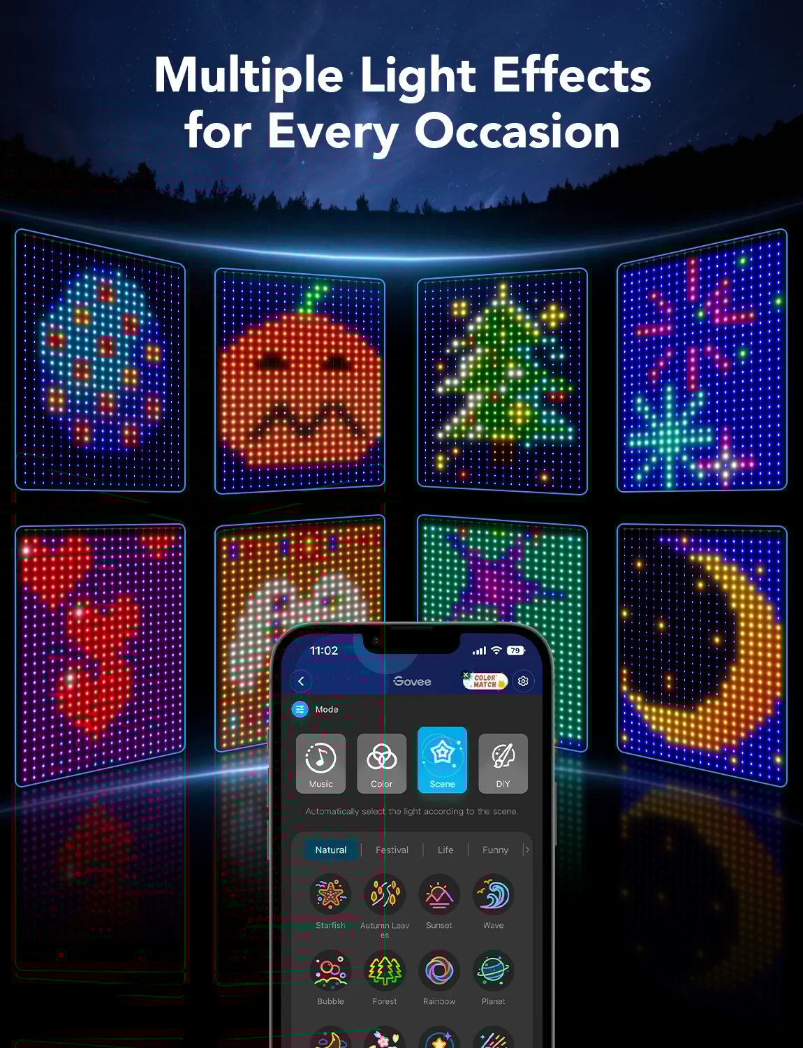 – Upload images or GIFs through the app to create a personalized light show! (Note: GIF support requires Game Mode to be activated.)